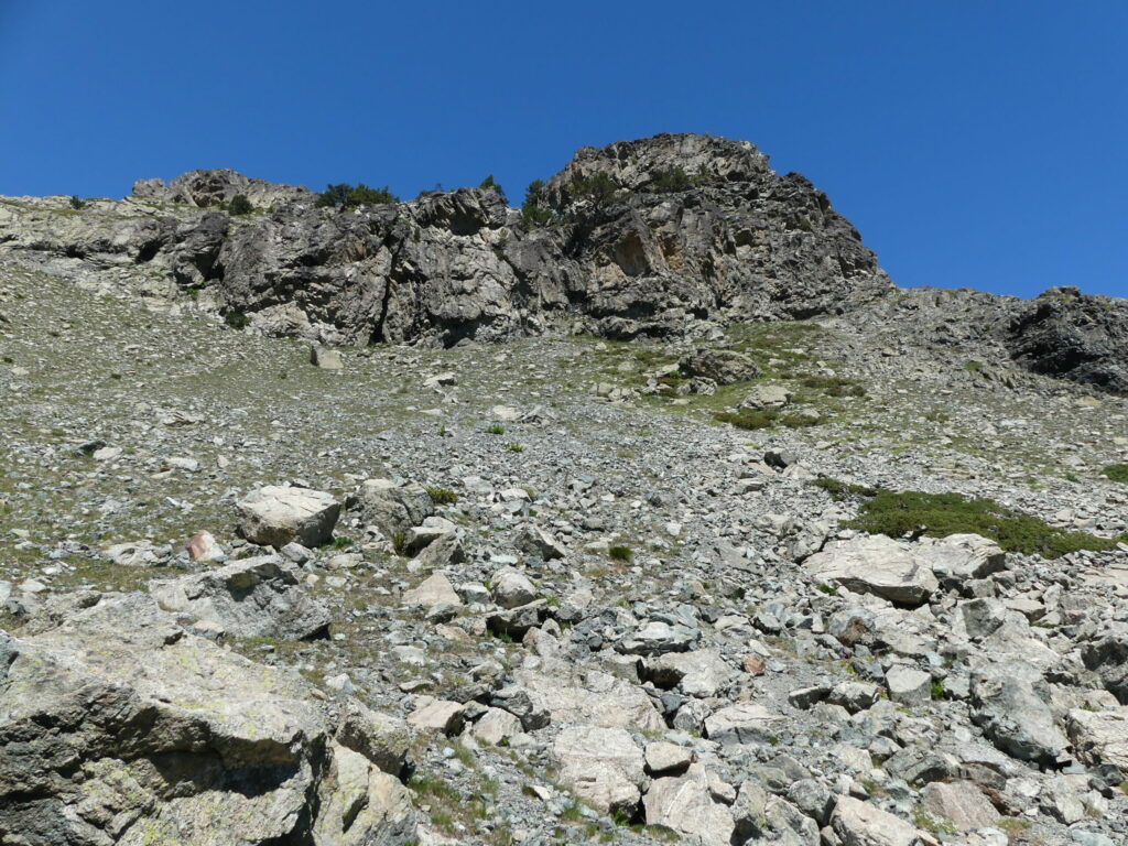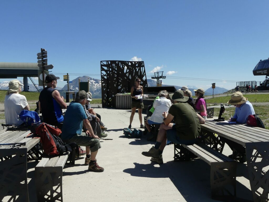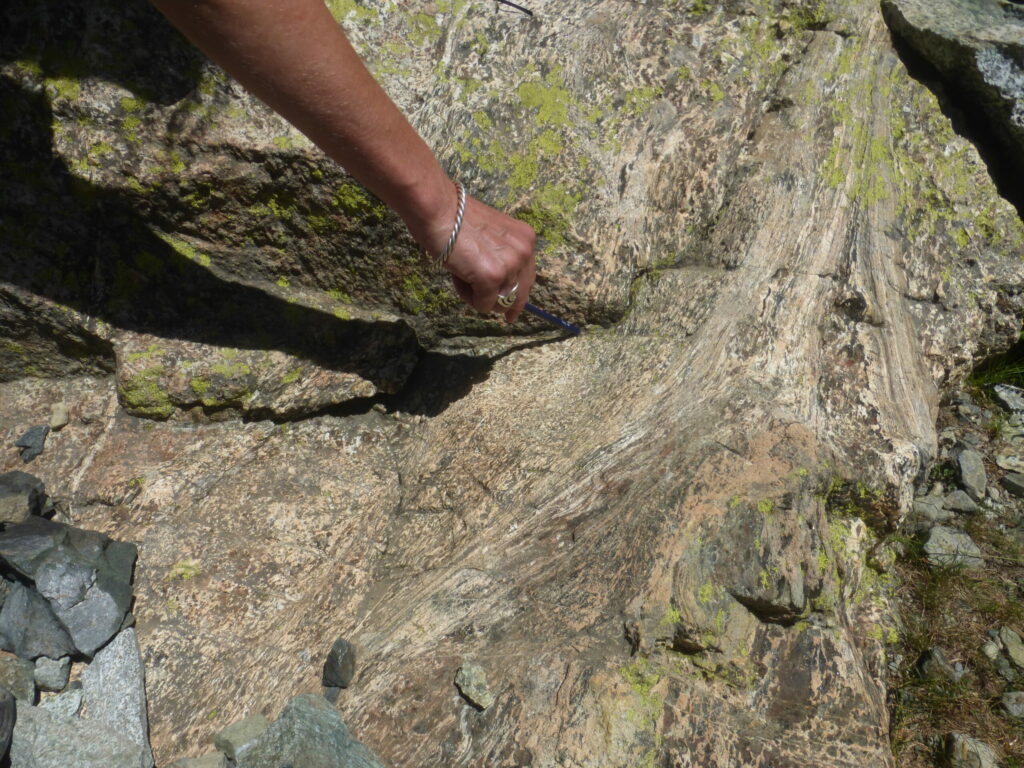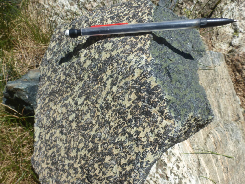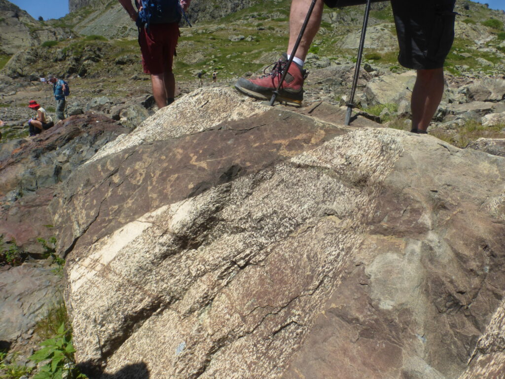 Parcours: Télécabine de la Croix de CHAMROUSSE puis sentier vers le Col de la Botte. Le premier affleurement est au niveau de l’arête du Col de la Botte on y trouve des serpentines. L’affleurement suivant est la zone de gros blocs blanchâtres écroulés (gabbros et chromitites) sous le sommet du Manqué en allant vers le Col des Lessines. Un troisième affleurement est un gros bloc orangé de manteau déformé en fin de descente vers les Lacs Robert. Le dernier se situe entre le bord est-sud-est du lac et la cabane avec les filons basaltiques dans les gabbros. Remontée à la Croix par la piste de ski.