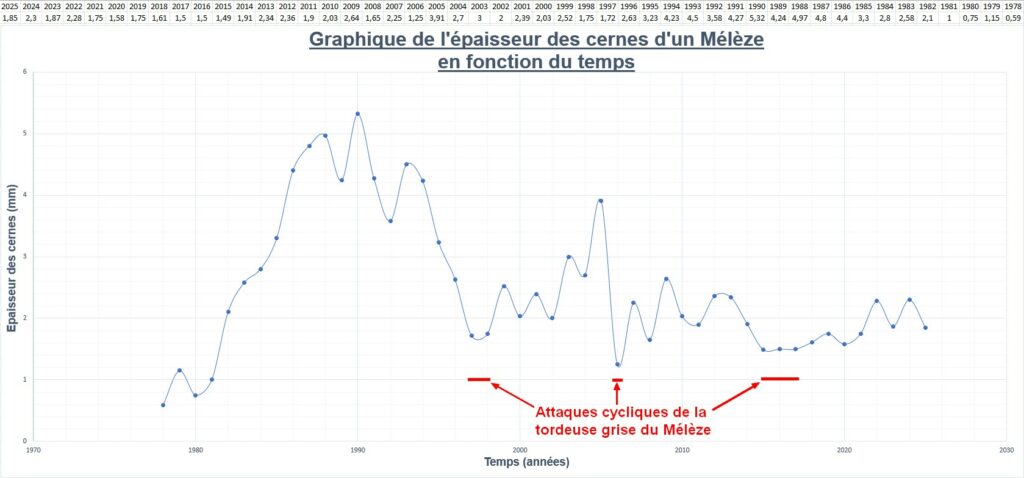Pour exploiter ce document il doit être mis en parallèle avec des données climatiques locales, avec la courbe de référence du Mélèze, avec d’autres courbes d’autres individus, avec les cycles d’attaque de la tordeuse… (se référer aux informations théoriques apportées ci-dessus)