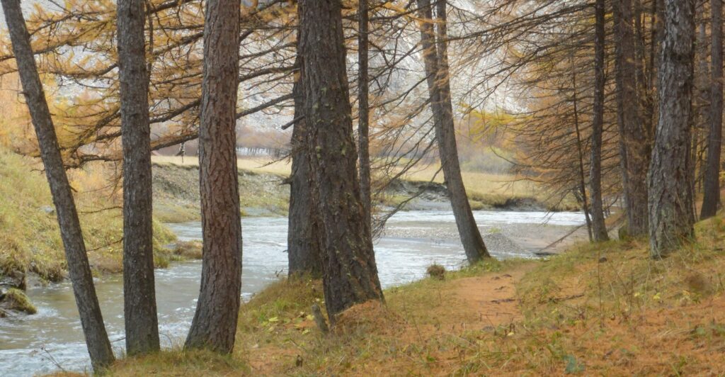 Mélèzes et Pins cembro (Pin arolle) poussent ensemble, ce sont deux arbres complémentaires. Après la déforestation massive entre le moyen âge et le 19e siècle les arbres qui ont recolonisé les versants sont uniquement des Mélèzes.