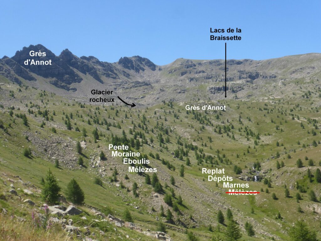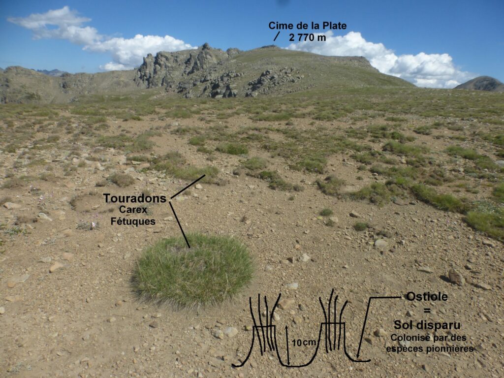 Sur ces crêtes la pelouse alpine était présente mais l’érosion a fait partir une partie du sol ne laissant que les touradons (touffes d’herbe avec du sol nu autour). Les quelques plantes pionnières qui poussent entre les touradons sont fragiles et sont entrainées par les eaux de ruissellement, laissant le sol nu. Les produits de l’érosion issus de ces hauteurs s’accumulent dans le Lac de la Braissette juste en dessous. L’érosion est accentuée par la présence humaine (pâturage des moutons).