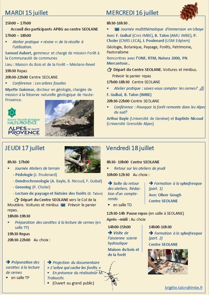 ForêtVerTE est un projet pluridisciplinaire d’animation scientifique et culturelle autour du thème des forêts et des paysages de montagne, qui associe un apprentissage à la démarche scientifique, à destination des enseignants de SVT (APBG) par la participation à la construction de données scientifiques sur le terrain, et à des animations grand public (conférences, sorties et ateliers pédagogiques en partenariat avec des acteurs locaux). Aix Marseille Université a pris en charge l’intervention scientifique par le financement du projet de culture scientifique ForêtVerTE. Organisation IMBE Brigitte Talon et APBG Armand Audinos